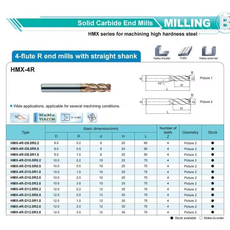 Available in various configurations, including straight and tapered designs, these end mills cater to different milling needs, from general machining to intricate, complex operations. The spiral flute design ensures smooth chip removal, while the taper design is perfect for precision detailing and angled cuts.