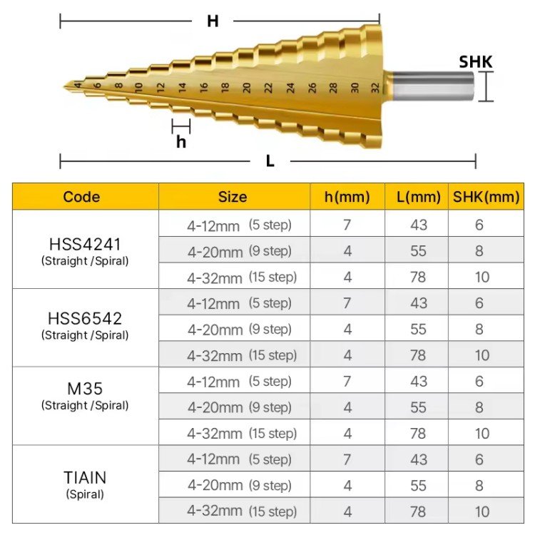 Multiple Steps: The multi-step design allows for drilling a range of hole sizes from 4mm to 32mm with one tool. This versatility is perfect for various applications like metal drilling, plastic, and woodworking.