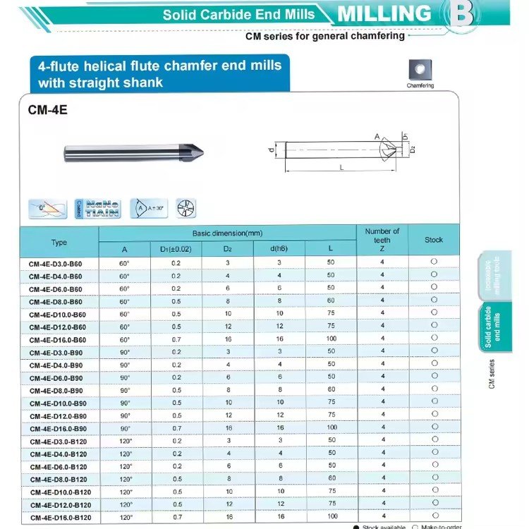 Built with solid carbide, the CM-4E series offers outstanding wear resistance and durability, making them suitable for both general and high-speed machining tasks. The chamfer angles range from 60° to 120°, providing versatility for different cutting requirements. These mills are specifically designed to ensure clean, precise chamfer cuts, helping to achieve superior surface finishes even on hard materials.
